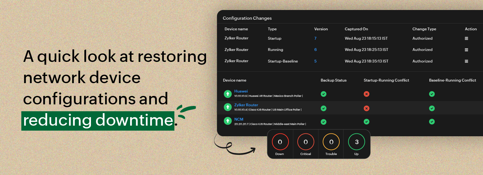 If you are among the many who are tired of getting lost in the labyrinth of network intricacies or are frustrated with frequent network outages, Site24x7's automated network configuration management solution is just for you. With Site24x7, you can finally say goodbye to the tangles of network management and hello to the convenience of user-friendly dashboards that provide you with real-time updates on your network's status.