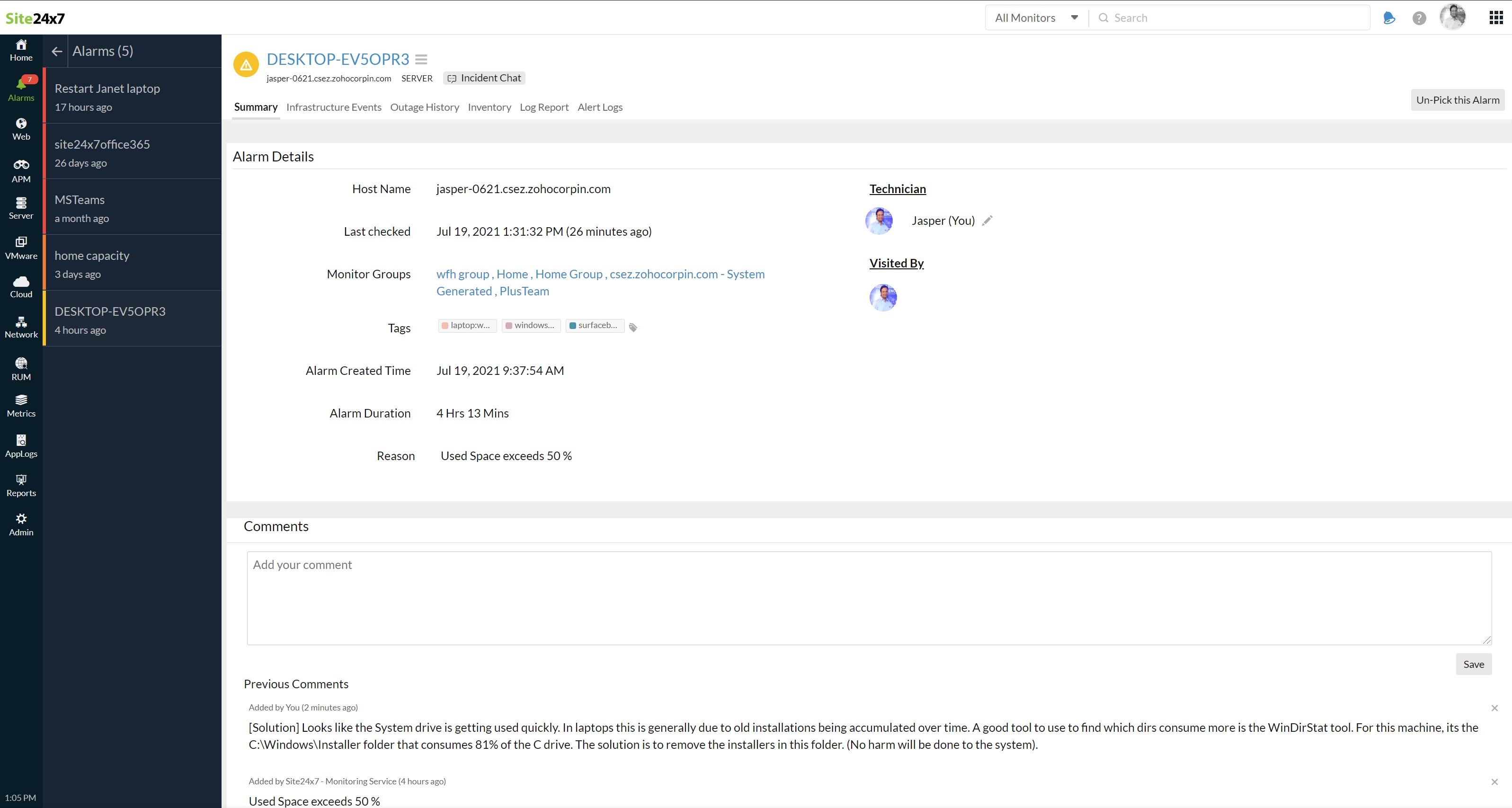 Every alarm has a comment section in the alarms details page -> Alarms tabs > select the alarm which you want to add a comment. Here you can add the comment for the incident that happened and add a solution for it so that its recorded and other technicians can look for it in future.