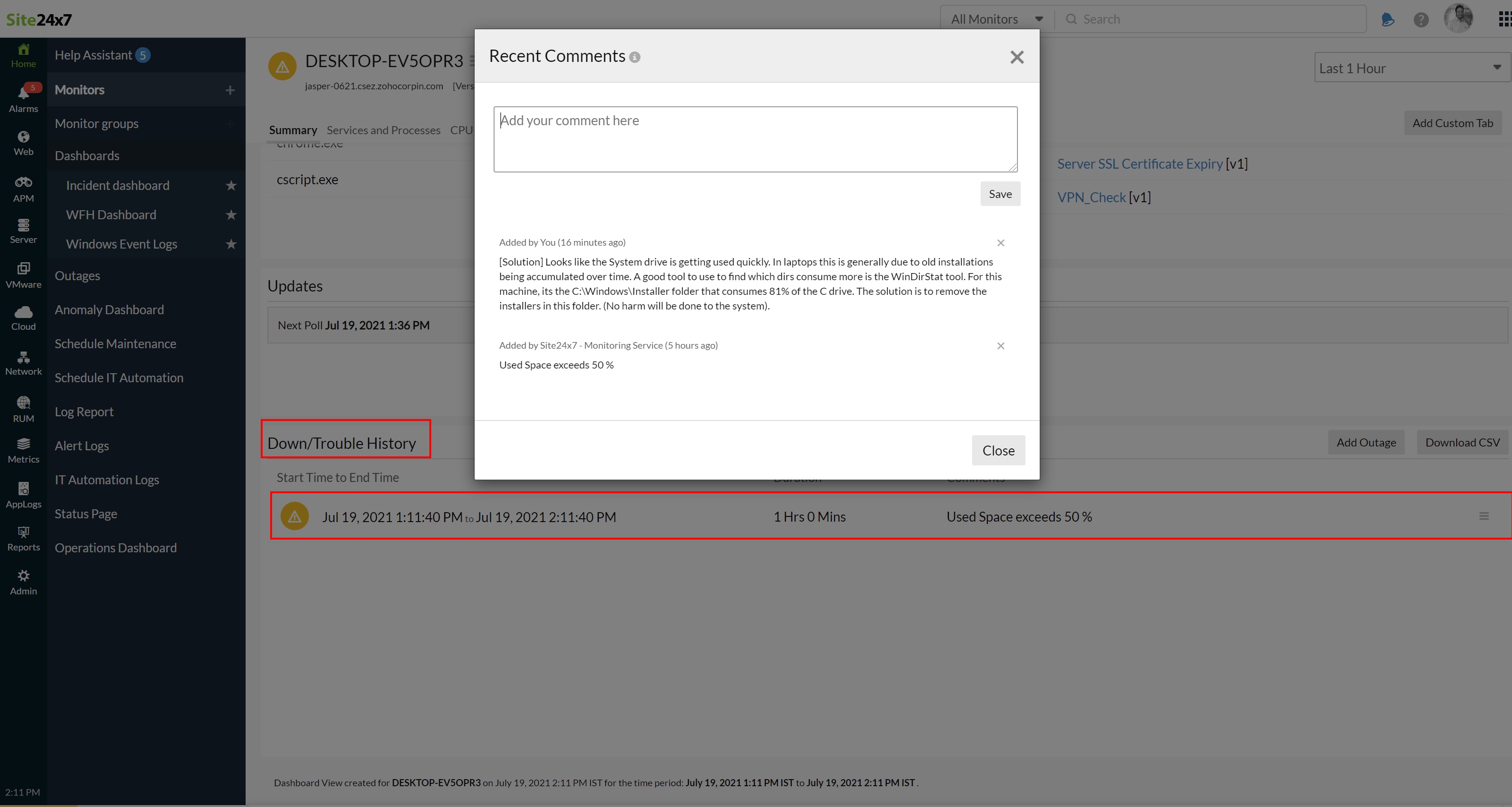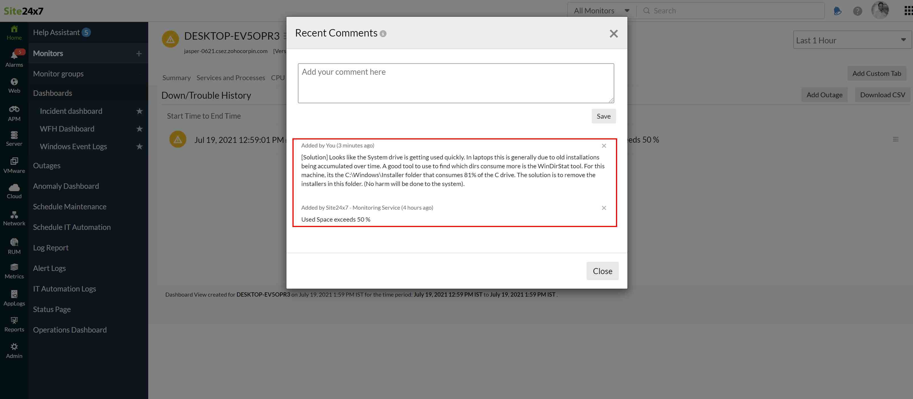 Since we store the comments at the monitor level, the same is comment from alarms is shown in the Outages tab of every monitor and vice-versa (scroll down to the end in server's summary page).