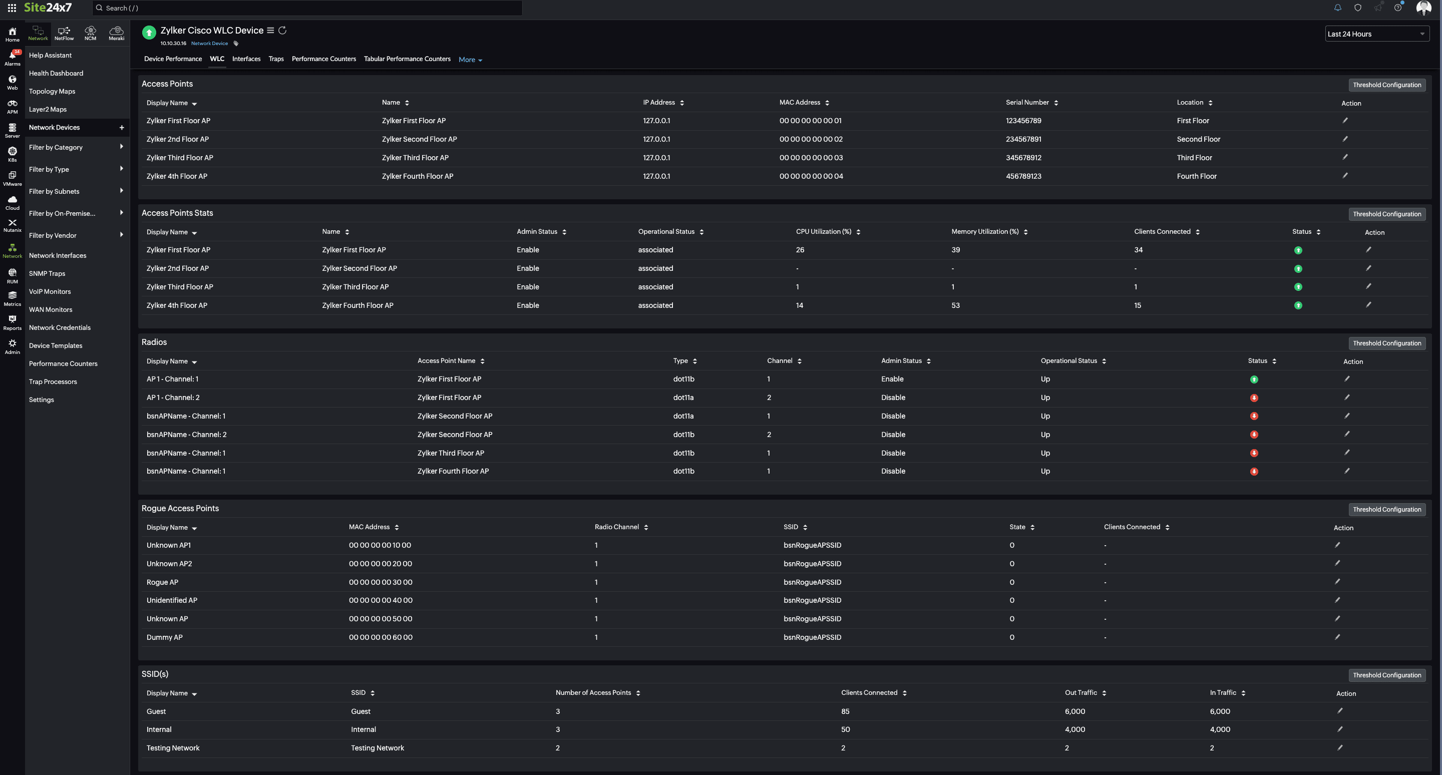 Our tool now provides detailed insights into Cisco wireless LAN controllers (WLCs) and makes it simple to track your access points, analyze their radios, and see how many access points are connected to a single SSID. Plus, it keeps an eye out for any rogue access points and also sends you instant alerts based on your threshold parameters.