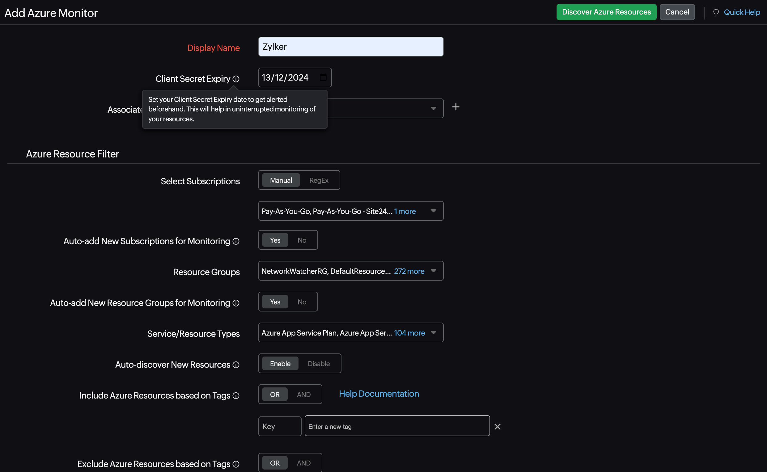 It is highly important to keep your client secret up to date because when the client secret expires, the Site24x7's Azure monitor can no longer track your Azure resources.