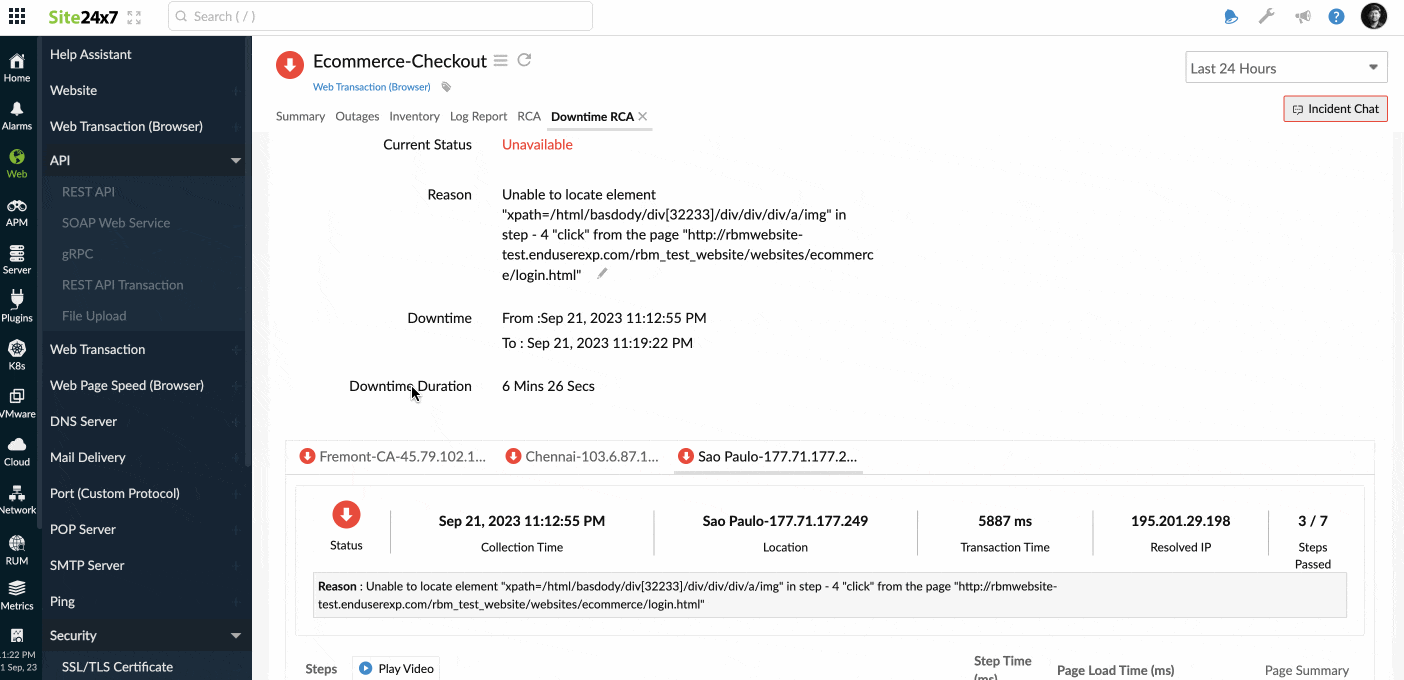 If you have internet services and application performance monitors (APM) created in Site24x7 for the same website or application, you can obtain application trace details that help debug your resources. With this seamless integration, you can view details on method calls, database queries, or exceptions related to the application that might affect the user experience. This is supported for Website, REST API, REST API Transaction, and Web Transaction (Browser) monitors. - Leverage the Lighthouse report to gain insights about web page speed (browser) monitors.