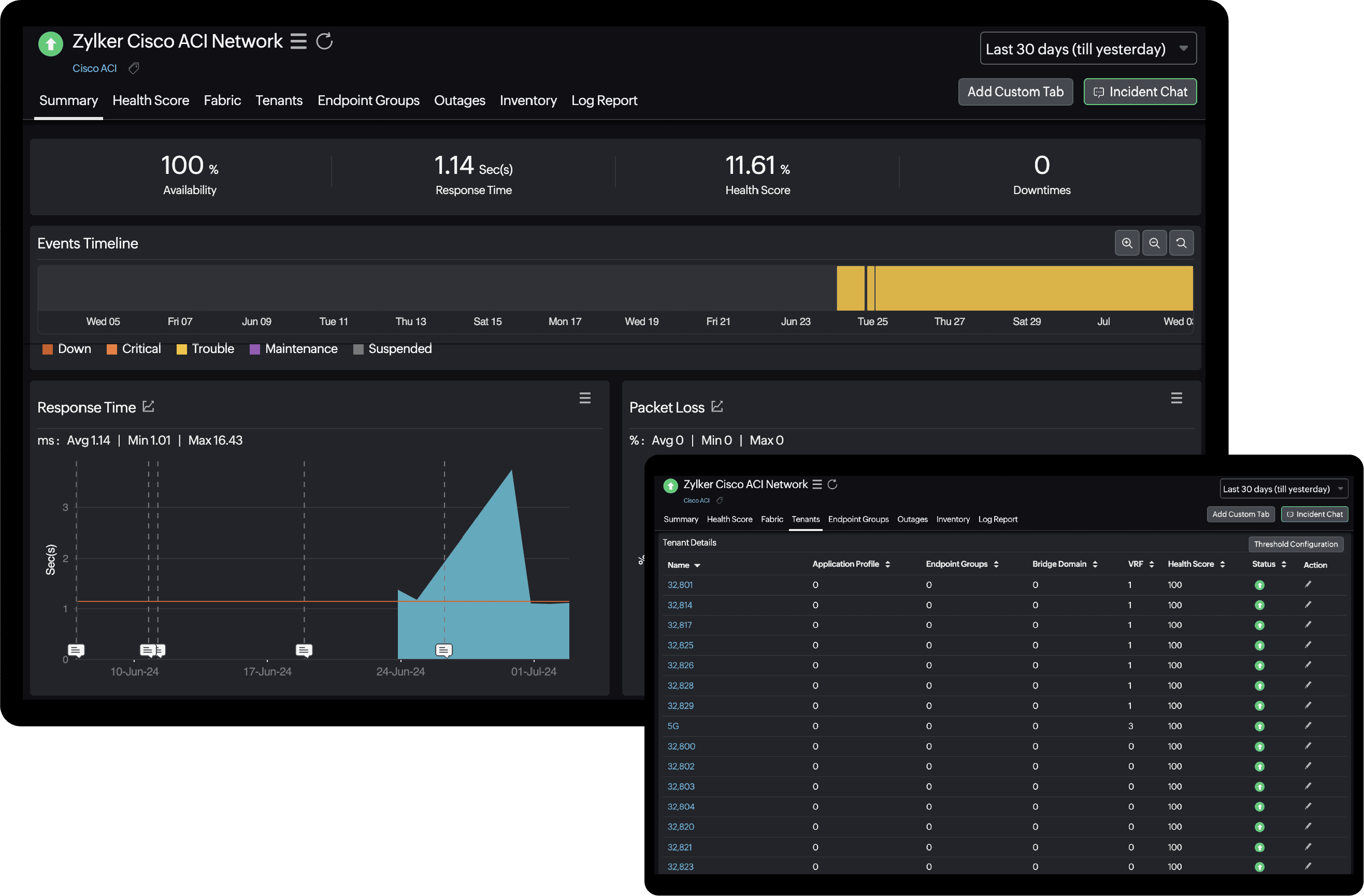 Site24x7 now supports Cisco ACI monitoring. By leveraging the Cisco Application Policy Infrastructure Controller (APIC) REST API, Site24x7 provides insights into the health of every element within the network fabric. Embrace the power of Site24x7's Cisco ACI monitoring tool for real-time status updates on your Cisco Nexus 9000 Series hardware.