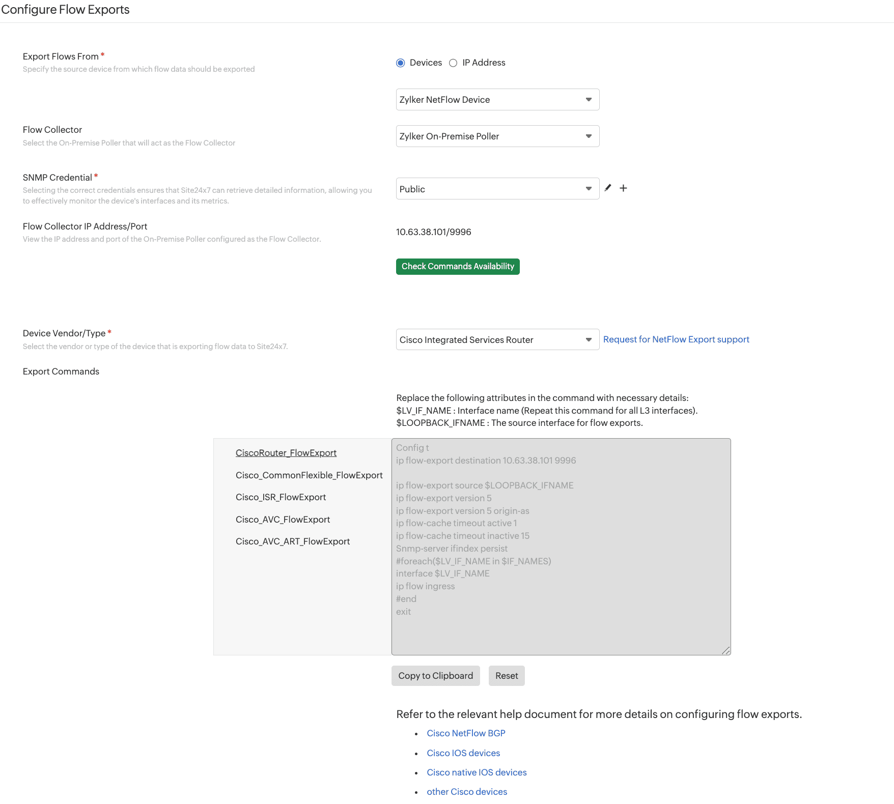 - Export Commands: Click Copy to Clipboard to copy the commands and execute them on your device to complete configuration. If you have valid SSH credentials, you can execute them on your device from Site24x7.