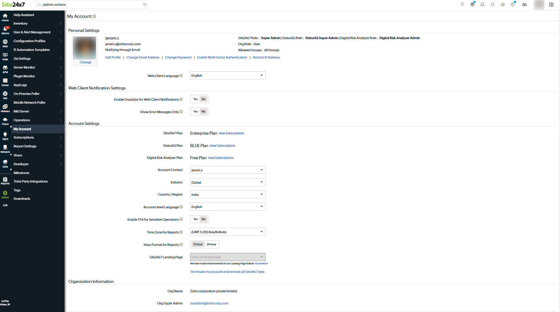 - Change Organization Name: Allows you to modify your organization name associated with you Site24x7 account.