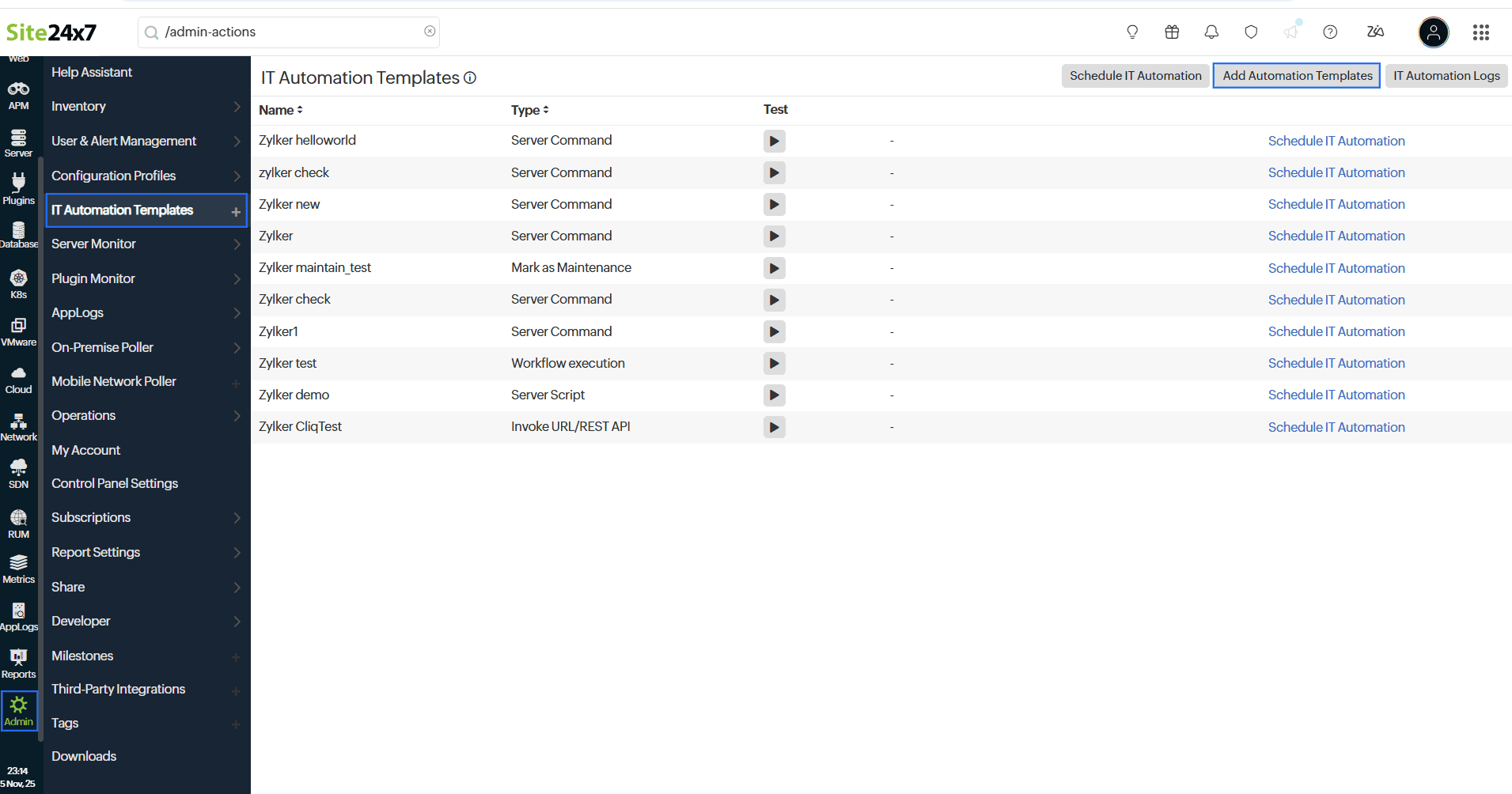 - From the left menu, navigate to Admin > IT Automation Templates.