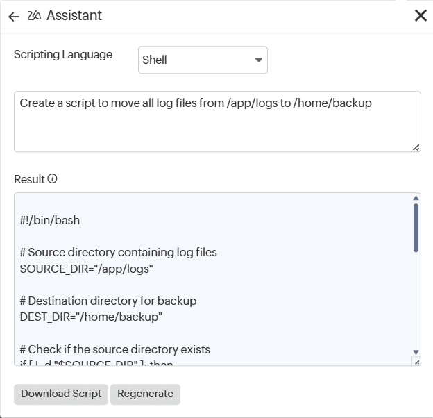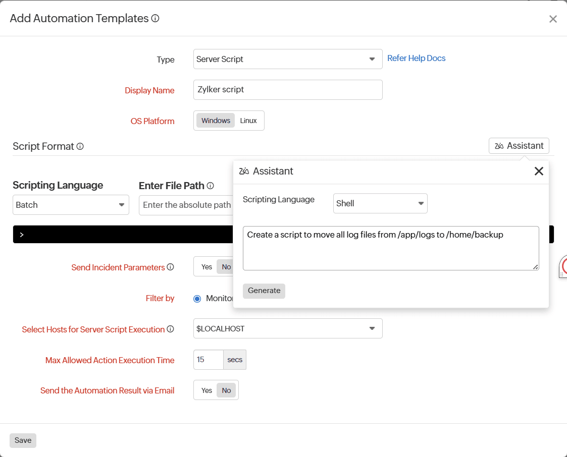 In IT Automation, you can use Zia to generate scripts and commands for your Server Script or Server Command automation templates by following the steps below: