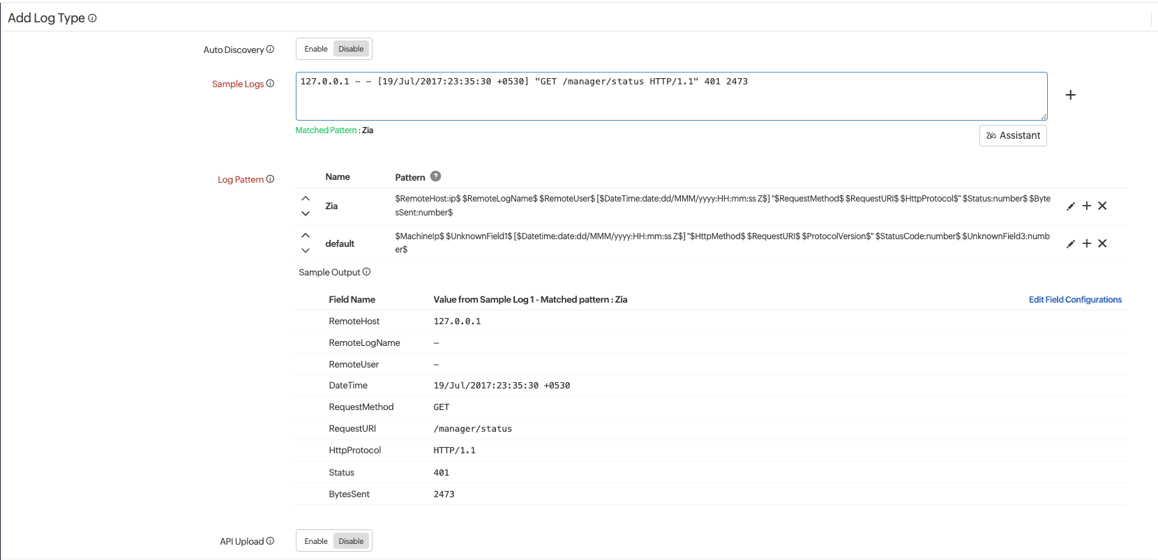 - Click Ask Zia near the Sample Logs, provide the sample log pattern and click Generate.