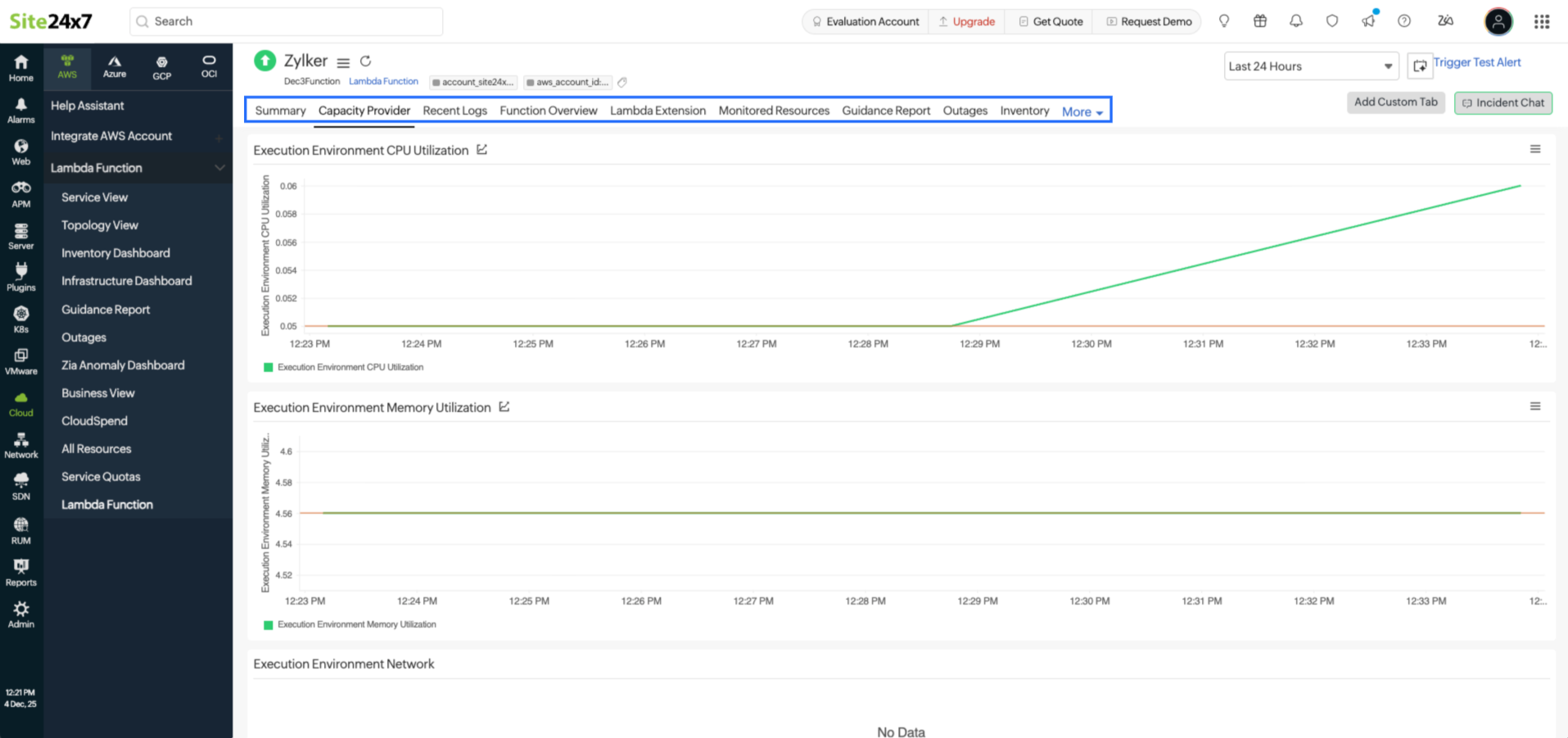 Without visibility into these metrics, it is difficult to know when the environment is overloaded; whether tasks are slowing down due to capped CPU or memory; if the configured concurrency limit is too low for the workload; or how disk and network activity changes as more tasks run. Site24x7 tracks all of these values and lets you configure thresholds and alerts based on what is actually happening inside the Lambda Managed Instances environment, allowing you to detect issues early and tune capacity with confidence.