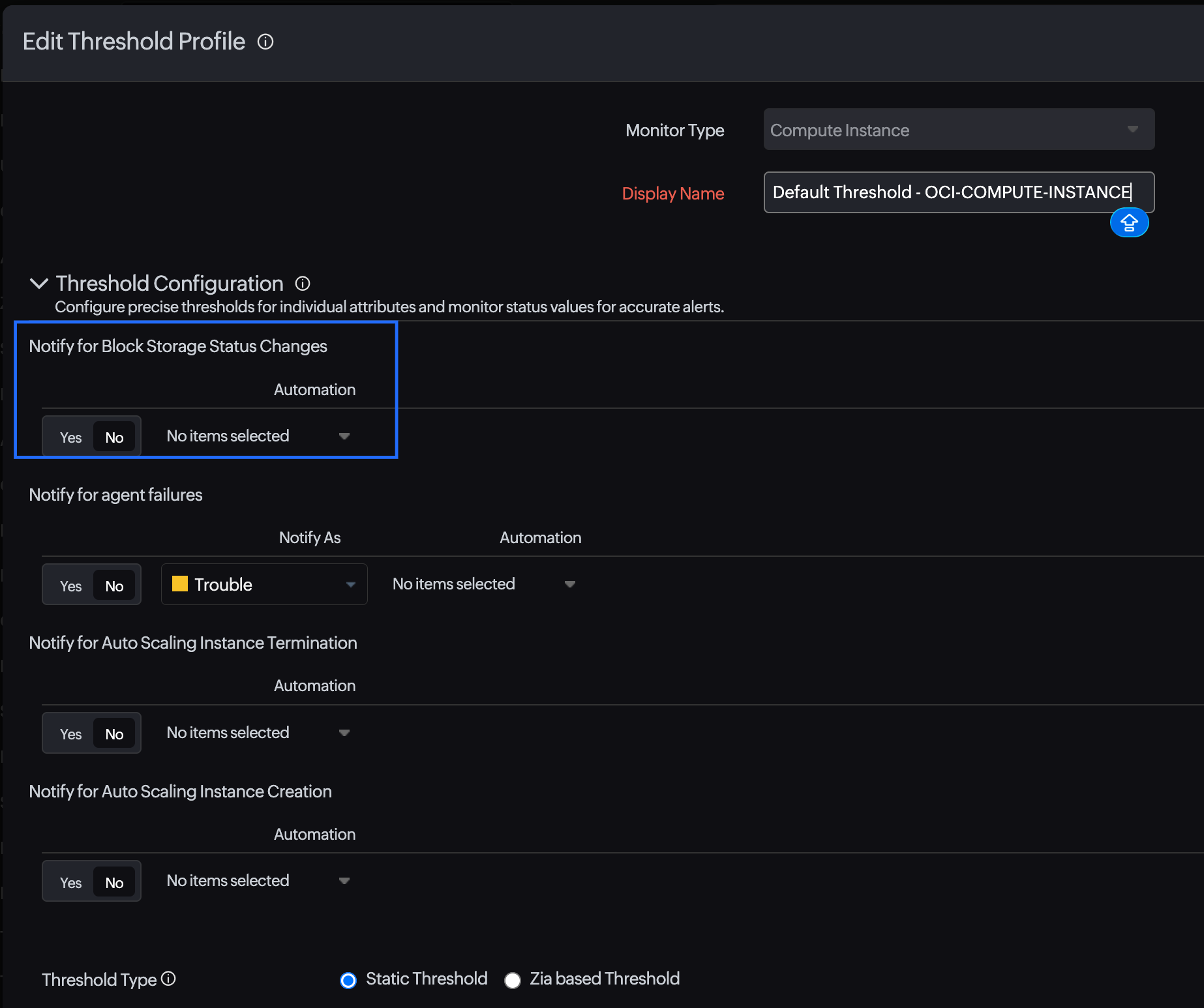- On the Edit Threshold Profile page, toggle the applicable child monitor's threshold configuration to Yes. For example, if you wish to enable status propagation for a Block Storage monitor, toggle the Notify for Block Storage Status Changes option on the Compute Instance monitor's Edit Threshold Profile page to Yes.