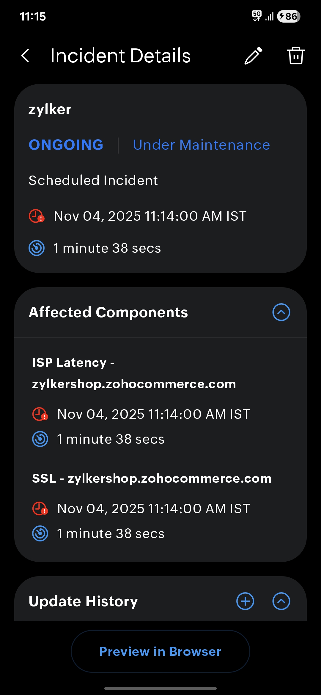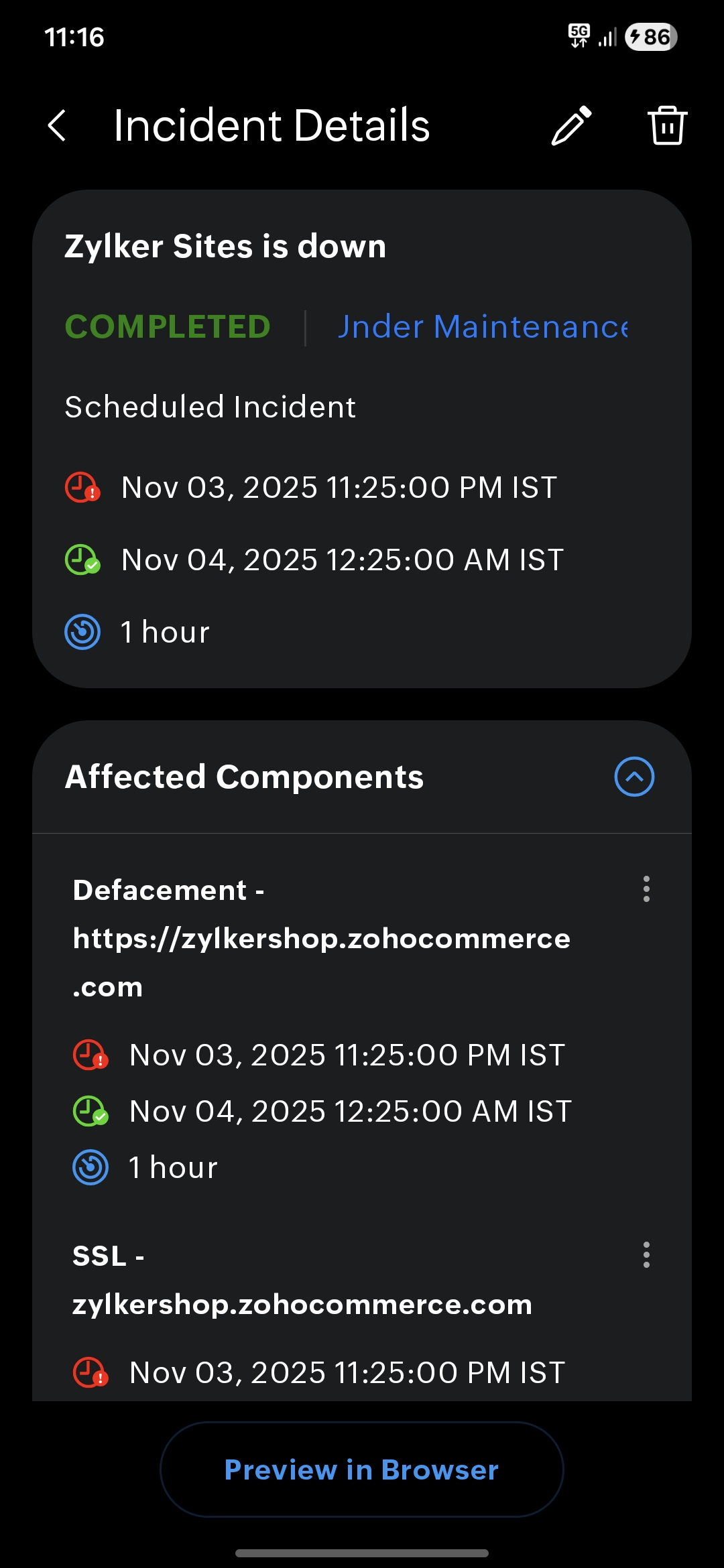 - Edit: Here you can modify Incident Title, Incident Severity, Incident Start Time, Time Zone, and Affected Components.