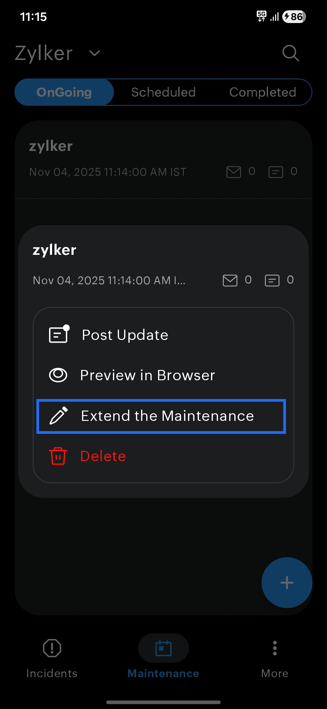 In case, the maintenance is taking longer than expected, you can extend your maintenance. To extend the maintenance follow the steps below: