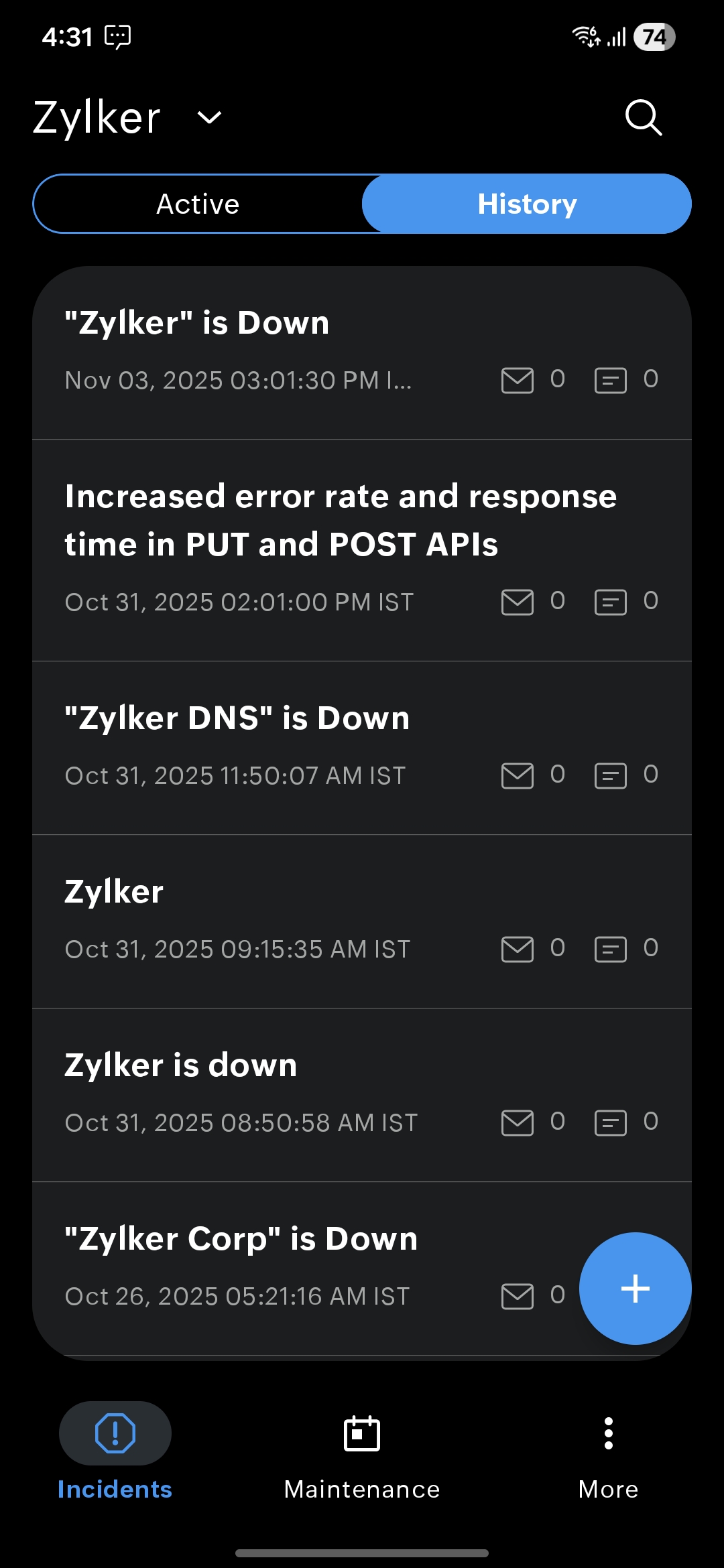 Incidents that are currently inactive or resolved are listed under the History section. Upon selecting an incident, the following details are displayed: